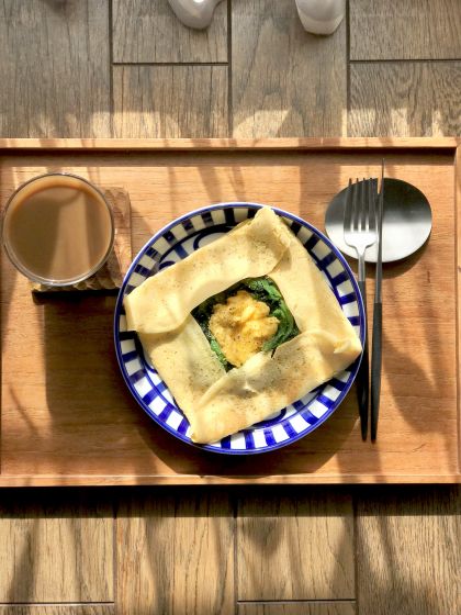 2015年08月23日の体重56.0kg/今朝の体重:50.3kg・体脂肪率:23.0% 【朝食】 ・コーヒー ・大豆プロテインのガレット(具:たまご、ほうれん草) ···