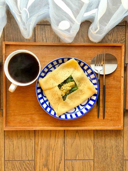2015年08月23日の体重56.0kg/今朝の体重:51.2kg・体脂肪率:23.0% 【朝食】 ・コーヒー ・大豆プロテインのガレット(具:たまご、ほうれん草) ···