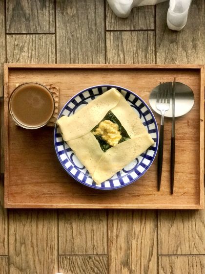2015年08月23日の体重56.0kg/今朝の体重:50.3kg・体脂肪率:22.8% 【朝食】 ・コーヒー ・大豆プロテインのガレット(具:たまご、ほうれん草) ···