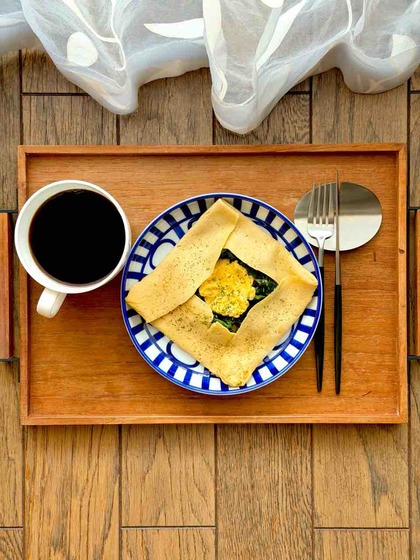 2015年08月23日の体重56.0kg/今朝の体重:51.4kg・体脂肪率:23.0% 【朝食】 ・コーヒー ・大豆プロテインのガレット(具:たまご、ほうれん草) ···